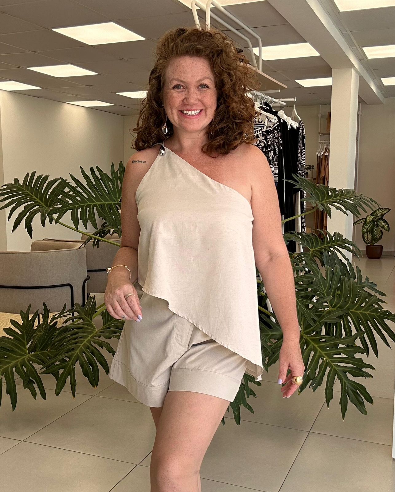 Detalhe principal: Modelagem assimétrica com caimento fluido e alças finas nas costas, criando um visual delicado e ao mesmo tempo marcante. O acabamento limpo valoriza o design minimalista da peça, enquanto o mix de fibras naturais garante conforto e respirabilidade.