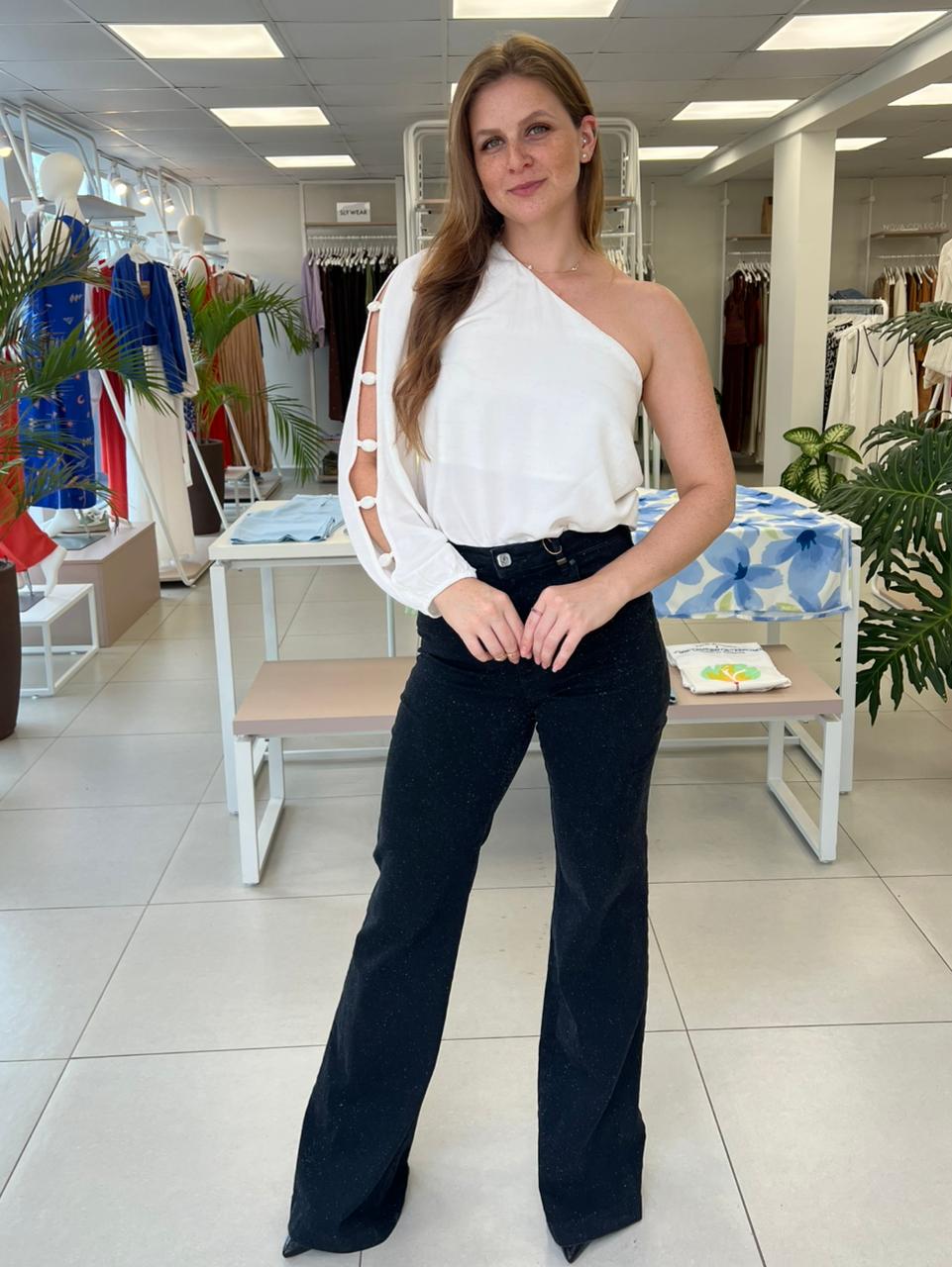 Detalhe principal: O grande protagonista é o brilho sutil (glitter) aplicado por toda a peça, conferindo um acabamento luminoso que eleva o denim tradicional. Apresenta a modelagem "Louise", uma base flare com toque de pantalona, com cintura alta e pernas que se abrem em uma elegante boca de sino a partir dos joelhos.
