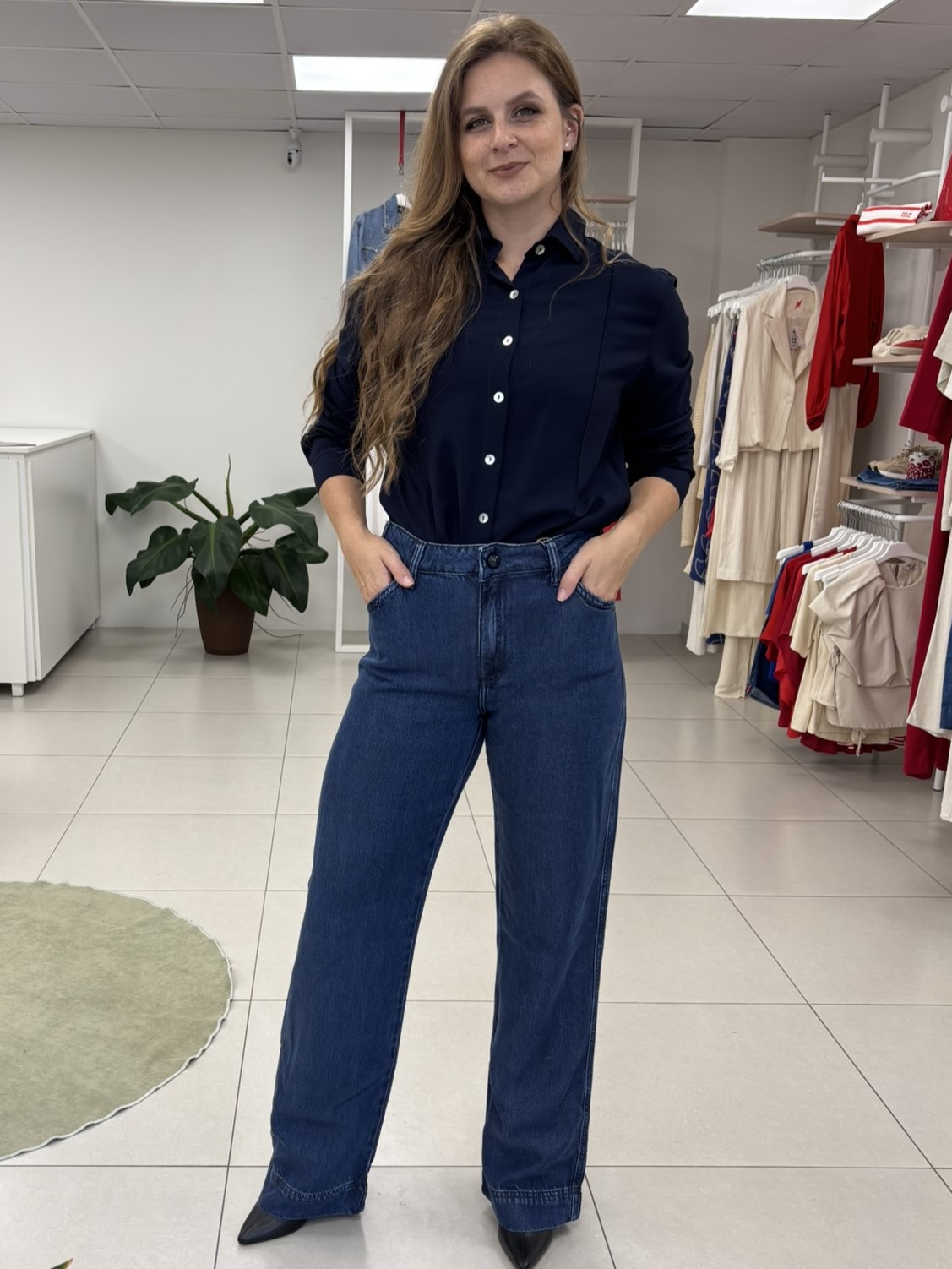 Caimento: Confeccionada em 100% Liocel, a peça possui um toque sedoso e uma fluidez que o jeans tradicional não alcança. O forro dos bolsos é composto por um mix de Poliéster e Algodão, garantindo resistência e acabamento superior.