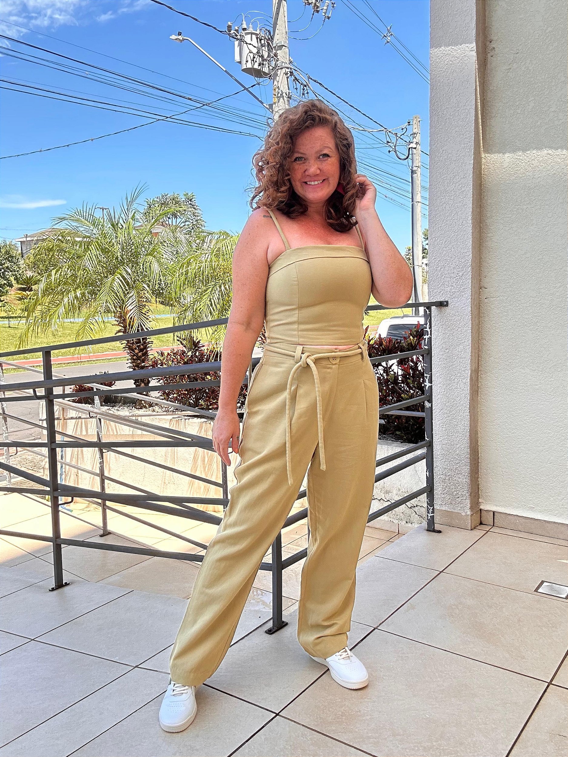 Caimento: Confeccionada em tecido plano com linho, oferece um toque nobre, texturizado e fresco. O cós com elástico nas costas garante conforto absoluto e adaptabilidade ao corpo, enquanto o caimento é leve e fluido ao longo das pernas.