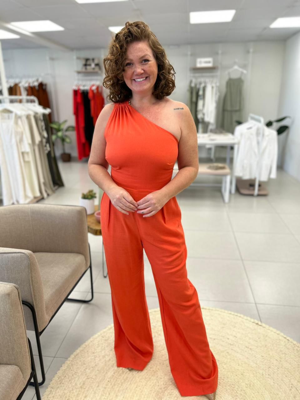 Macacão feminino confeccionado em mistura de viscose com linho, que proporciona toque natural, leveza e conforto ao vestir. O modelo de um ombro só traz uma proposta moderna e sofisticada, ideal para composições elegantes e práticas.