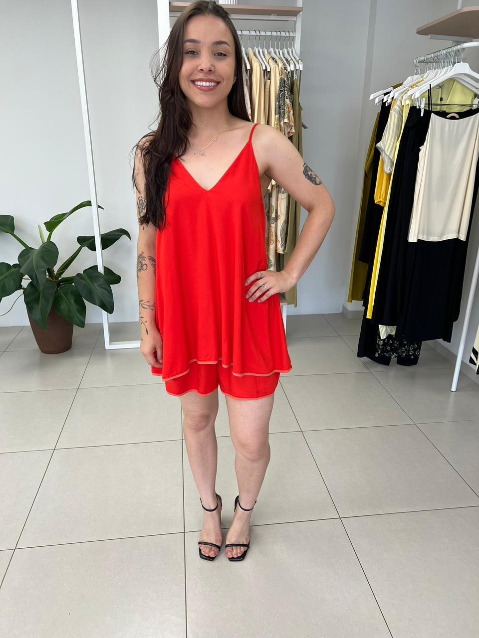 Macacão curto, com decote em V e alças finas, apresentando uma modelagem leve e solta que oferece movimento e frescor.