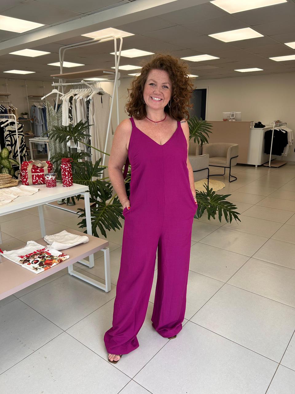 Macacão desenvolvido em linho leve e fluido, com decote em V e alças finas, trazendo uma proposta elegante e confortável para diversas ocasiões. A modelagem ampla alonga a silhueta e garante movimento ao vestir.