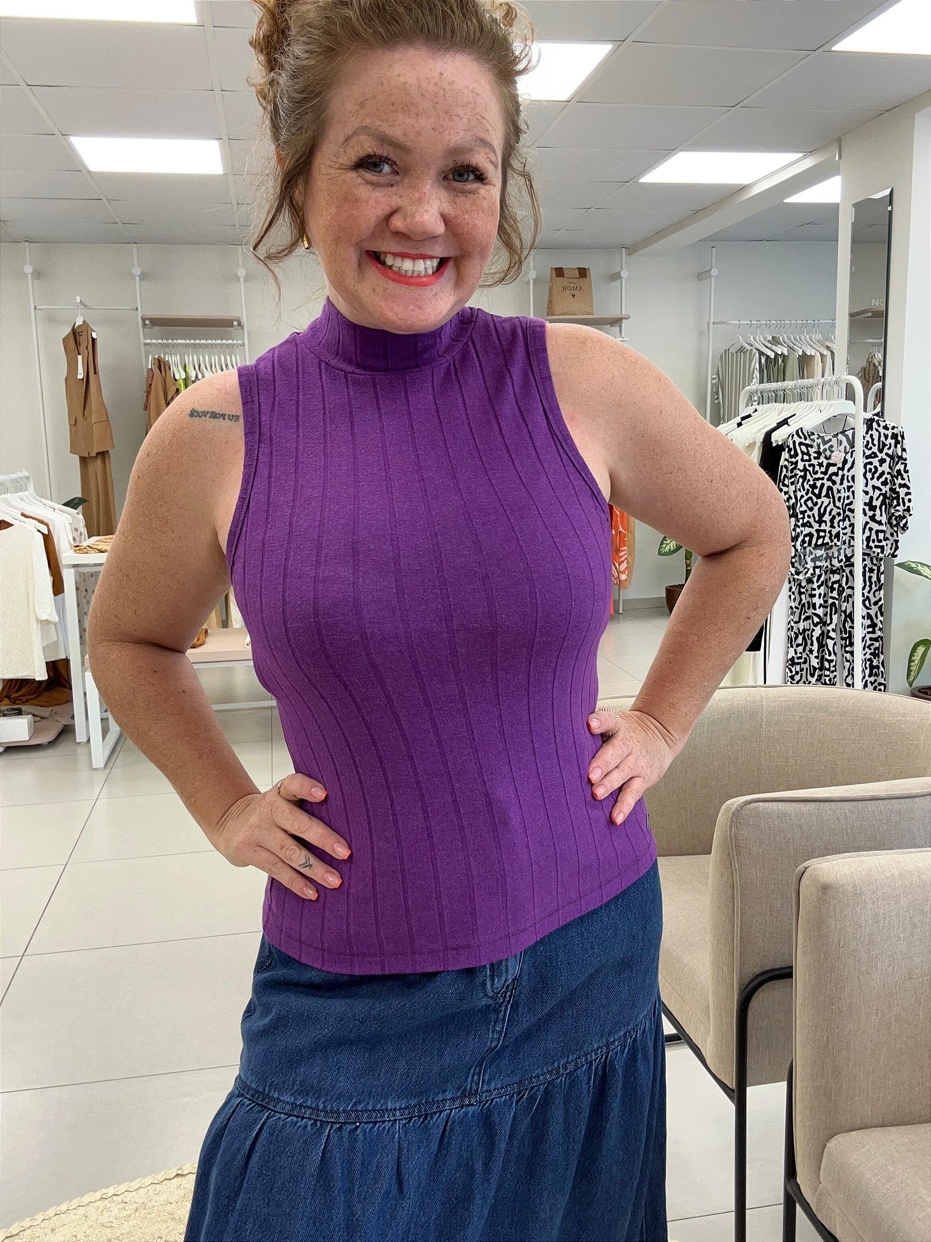 A Regata Canelada Gola Alta é uma peça essencial com toque contemporâneo. Com modelagem ajustada e textura canelada, ela valoriza a silhueta de forma elegante, sendo perfeita para composições minimalistas e sofisticadas.