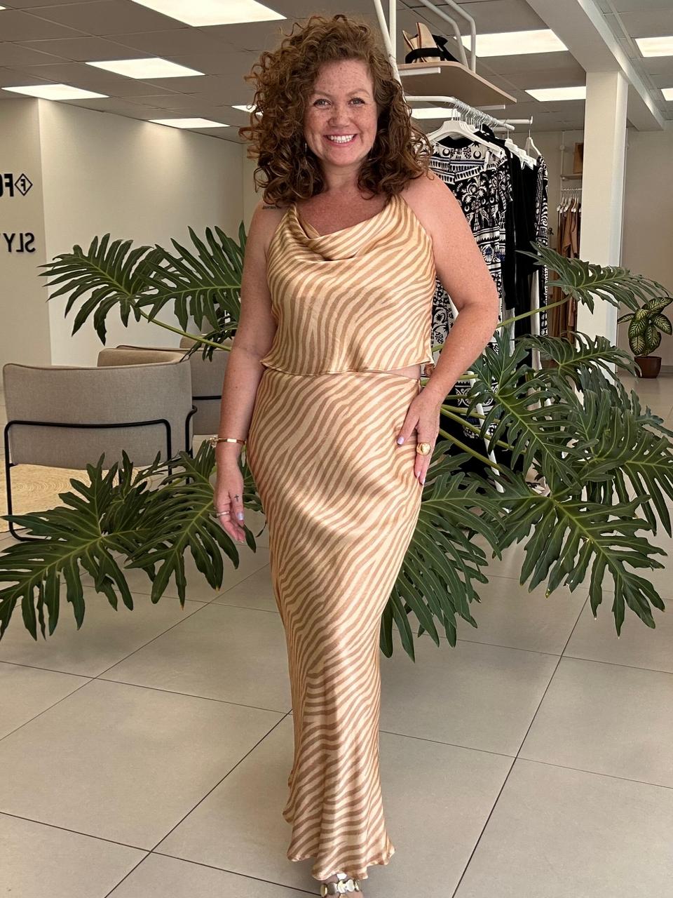 Saia longa confeccionada em viscose acetinada, com caimento leve e fluidez que valorizam o movimento e a silhueta de forma natural. A modelagem levemente justa ao corpo equilibra elegância e conforto, enquanto a barra fluida confere leveza e sofisticação ao visual.