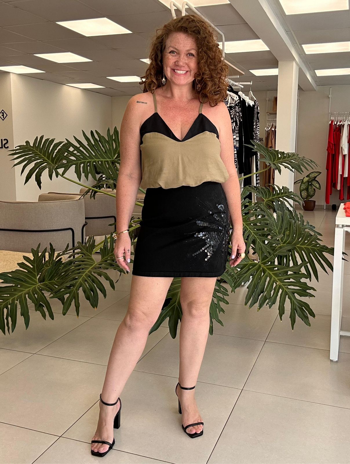 Detalhe principal: Bordado em paetês pretos formando um desenho radial inspirado em folhas e ramos, com aplicação delicada que adiciona textura, profundidade e um toque de brilho elegante à saia.
