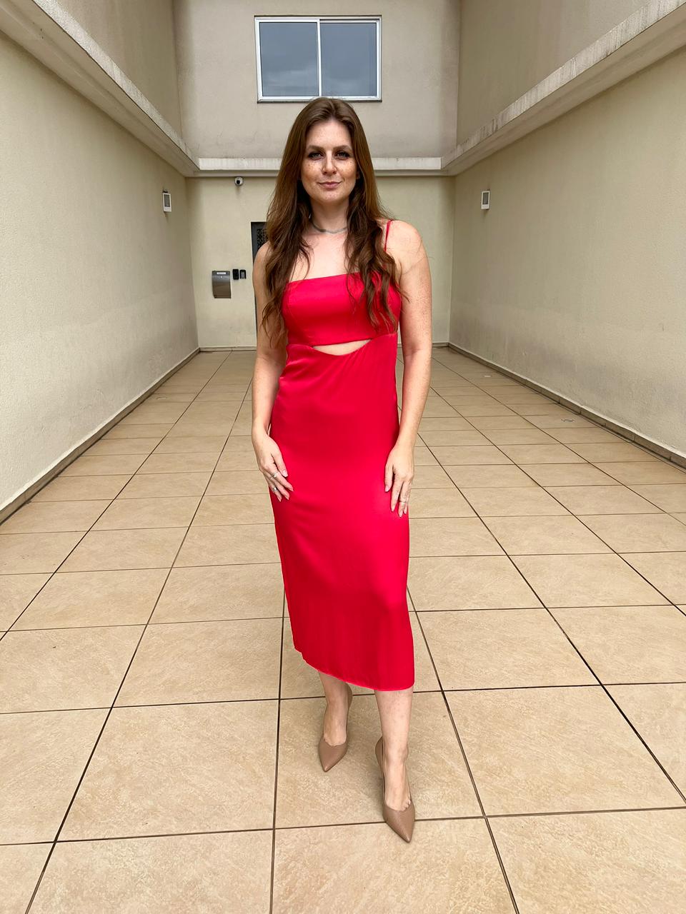 Vestido midi de proposta minimalista e feminina, com alças finas e design clean, pensado para valorizar o corpo com leveza e elegância.