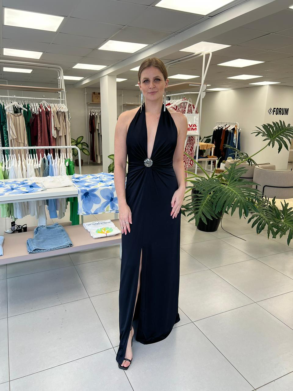 Vestido longo estilo frente única (halter neck), com decote profundo e alças que se prendem atrás do pescoço.