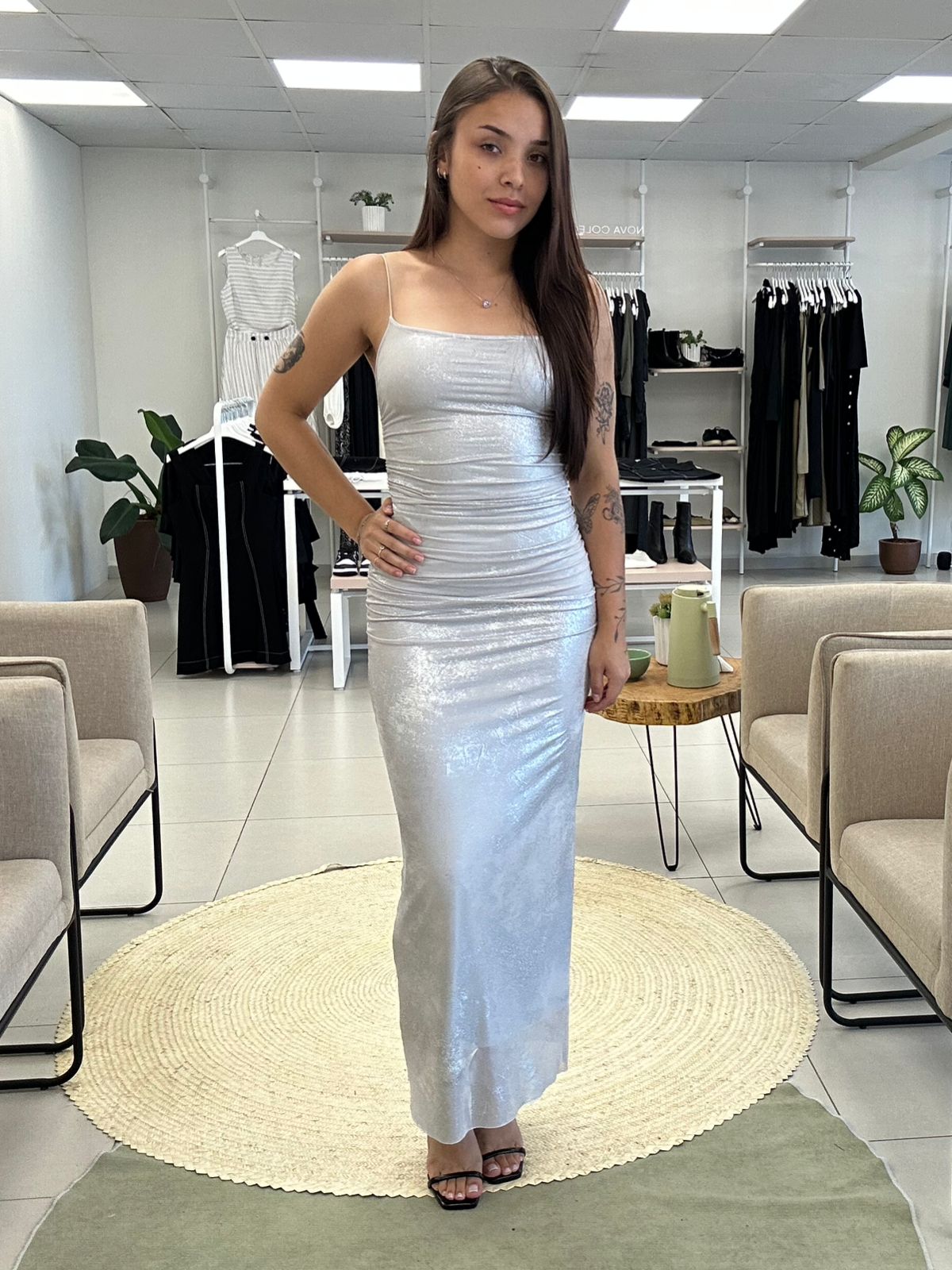 Detalhe principal: O destaque é o acabamento em tecido foil, que confere um brilho metálico intenso e sofisticado à peça. Possui decote reto moderno, alças finas delicadas e franzidos laterais que percorrem o corpo, criando um drapeado elegante.