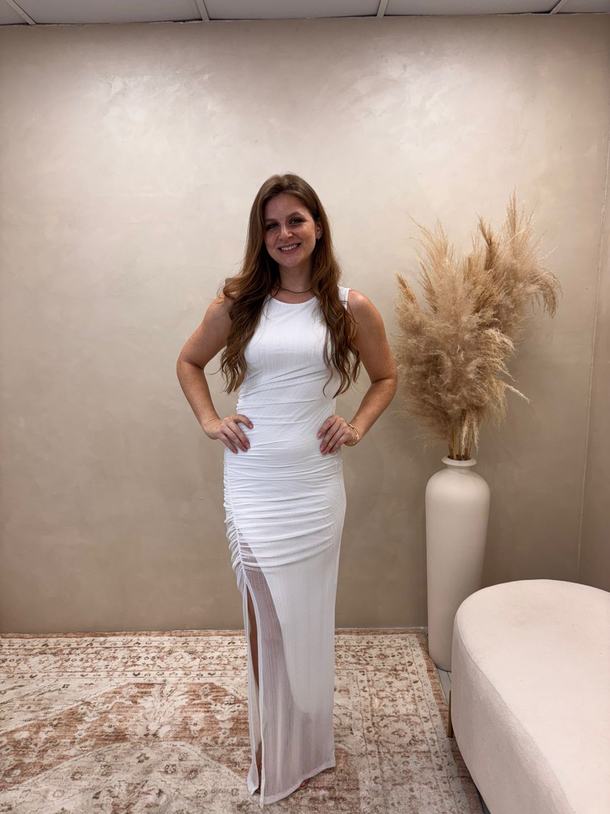 Detalhe principal: Drapeado contínuo que cria textura e profundidade ao visual, combinado à fenda frontal discreta que adiciona feminilidade e fluidez à peça.